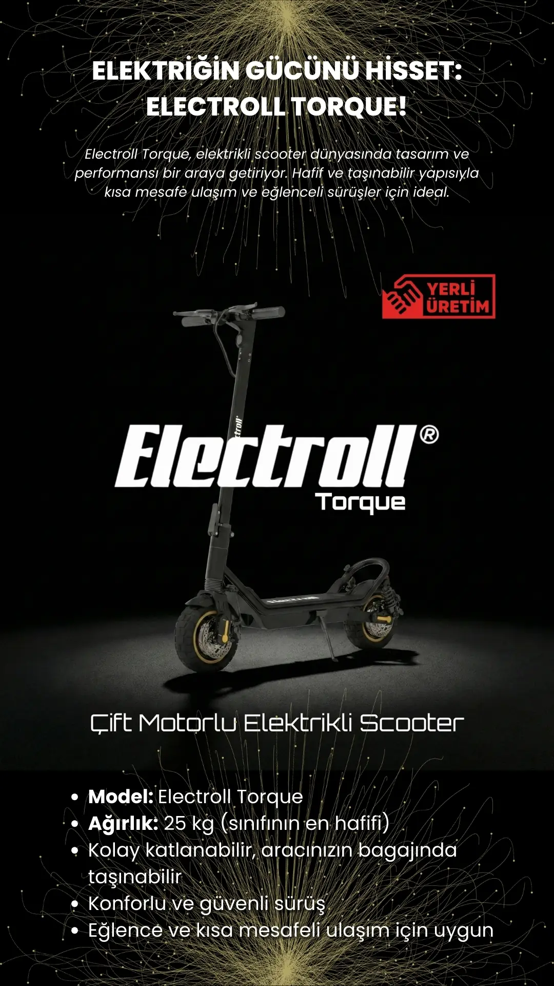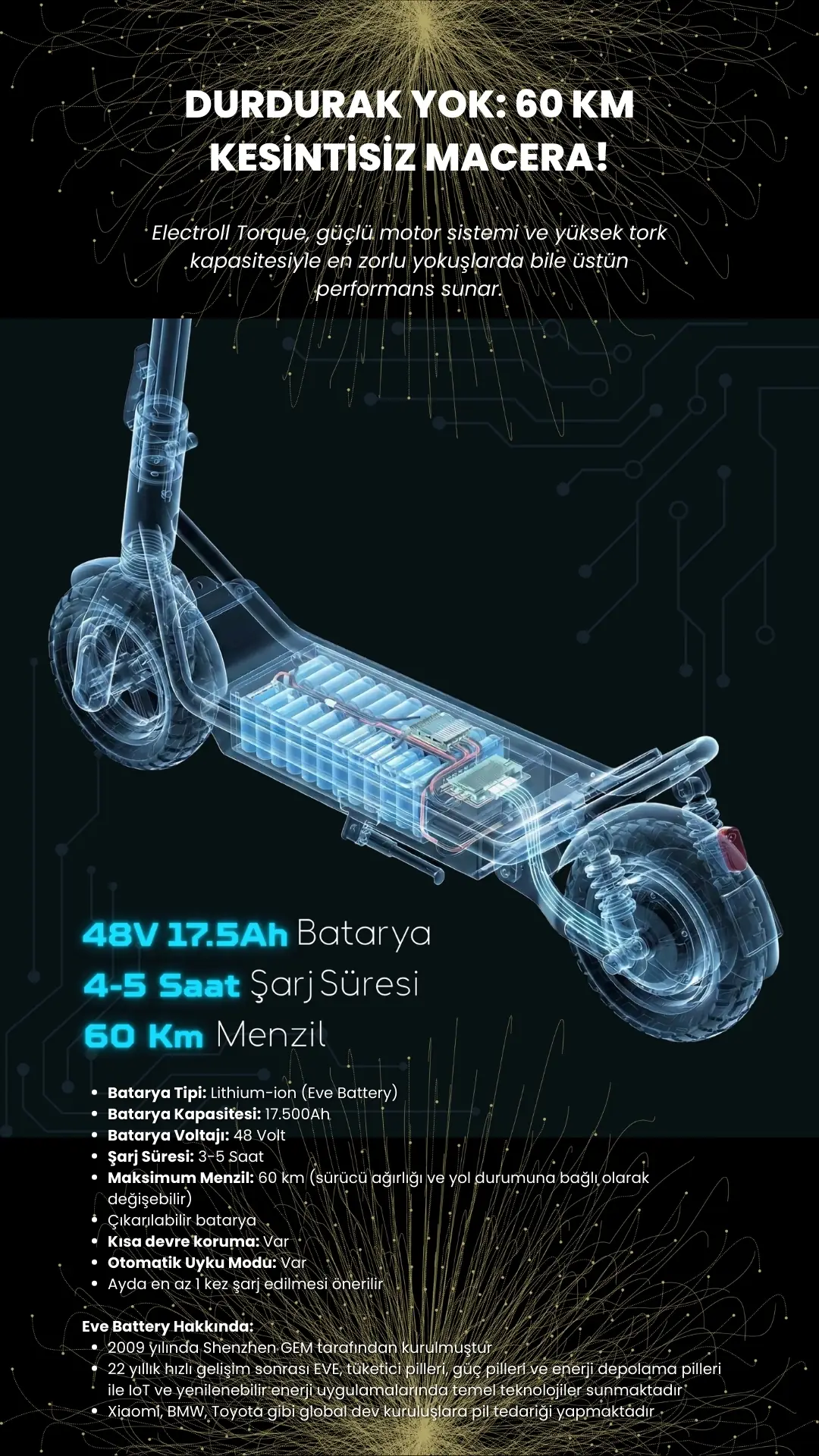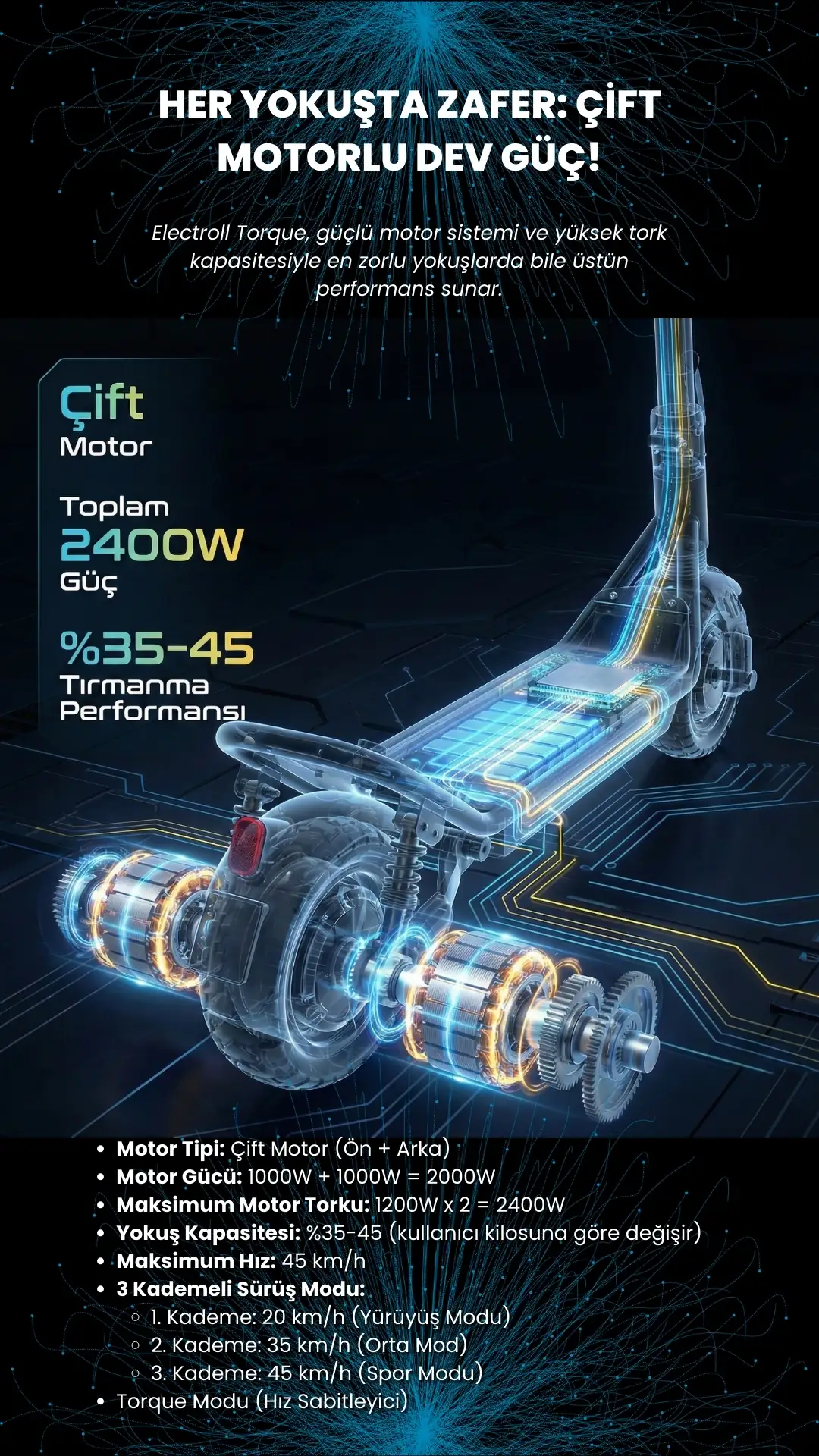Electroll Torque 2400W Tork Gücü Çift Motor Elektrikli Scooter | 17.5Ah Sökülebilir Batarya | Süspansiyonlu